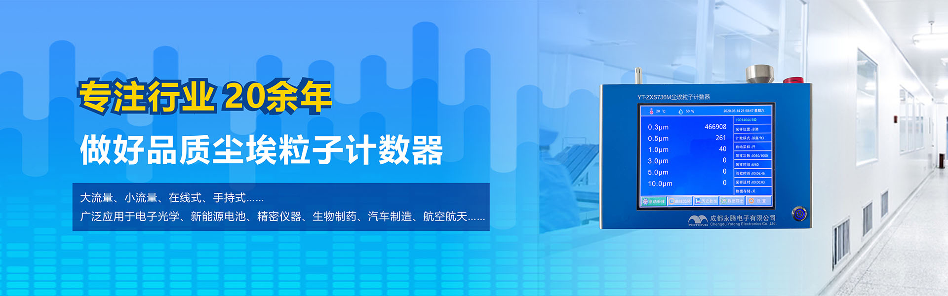 成都永騰電子有限公司位于成都市國家經濟技術開發(fā)區(qū),是一家專業(yè)從事環(huán)境空氣監(jiān)測儀器研發(fā)、生產、銷售于一體的高科技企業(yè)。產品涵蓋空氣檢測儀器、潔凈間在線塵埃粒子計數(shù)器監(jiān)測系統(tǒng)、大氣顆粒物監(jiān)測微站系統(tǒng)、電化學分析儀器、實驗室設備等產品。